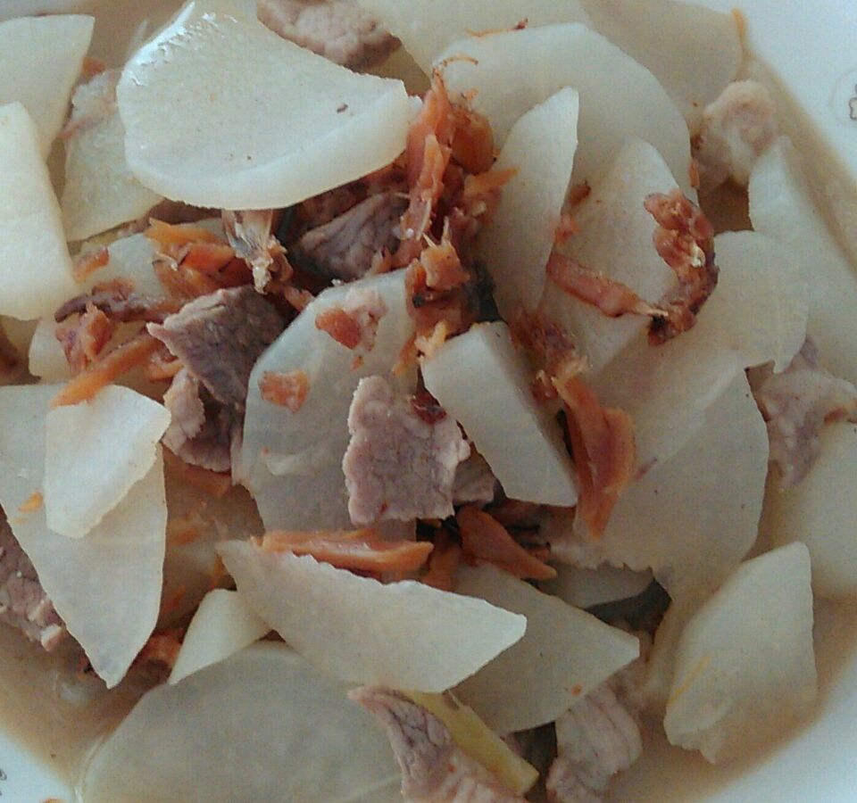 - 热锅放油,倒入蟹干爆香后,加入瘦肉、蒜姜末翻炒,再放白萝卜翻炒,加适量的盐、水闷煮至收汁即可。