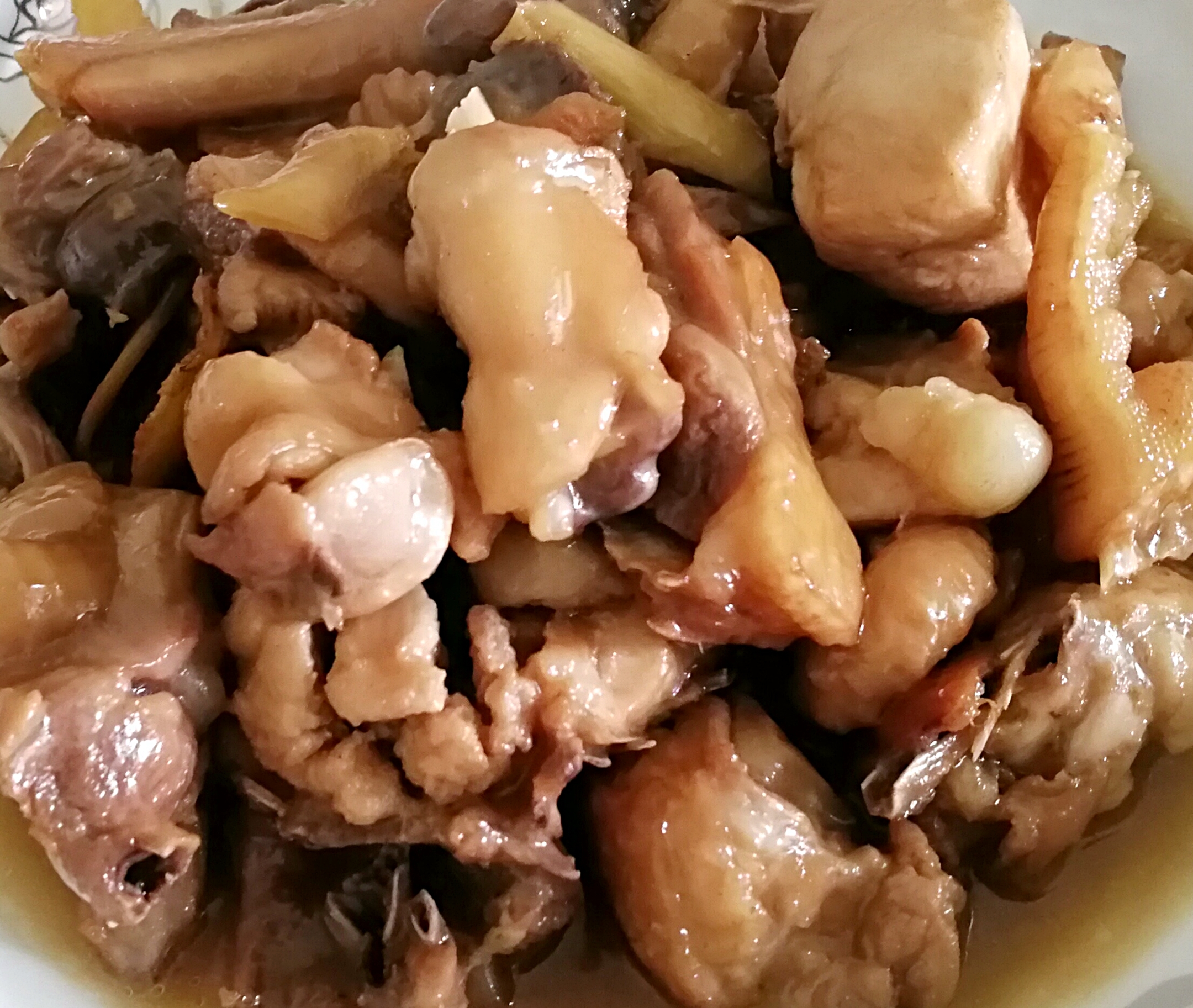 - 热锅下油,放入生姜,鸡肉翻炒