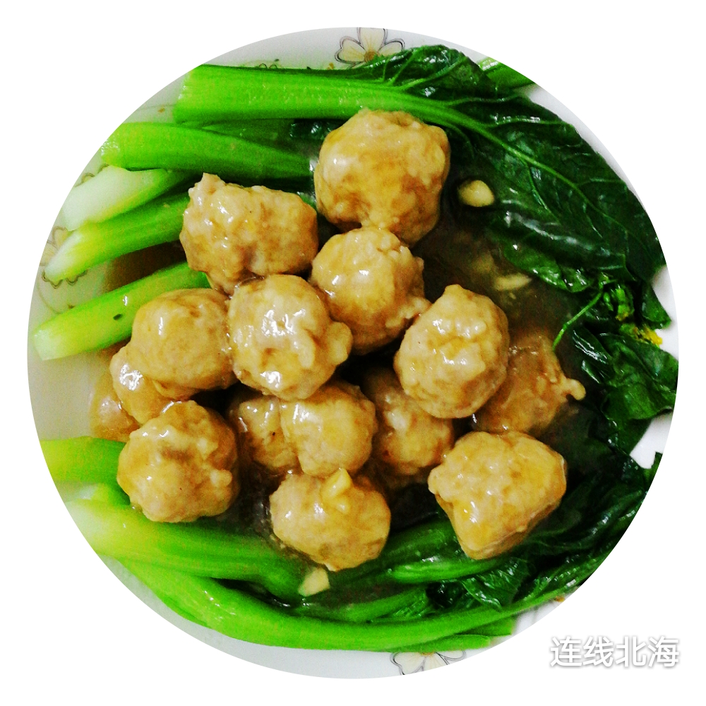- 菜心洗净,烫熟,摆入盘中,丸子也放入盘